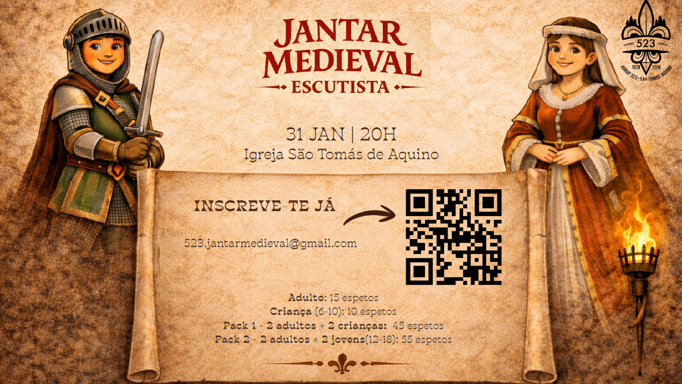 20h00 - Jantar Medieval organizado pelo Agrupamento dos Escuteiros. Podem fazer a inscrição em: 523.jantarmedieval@gmail.com