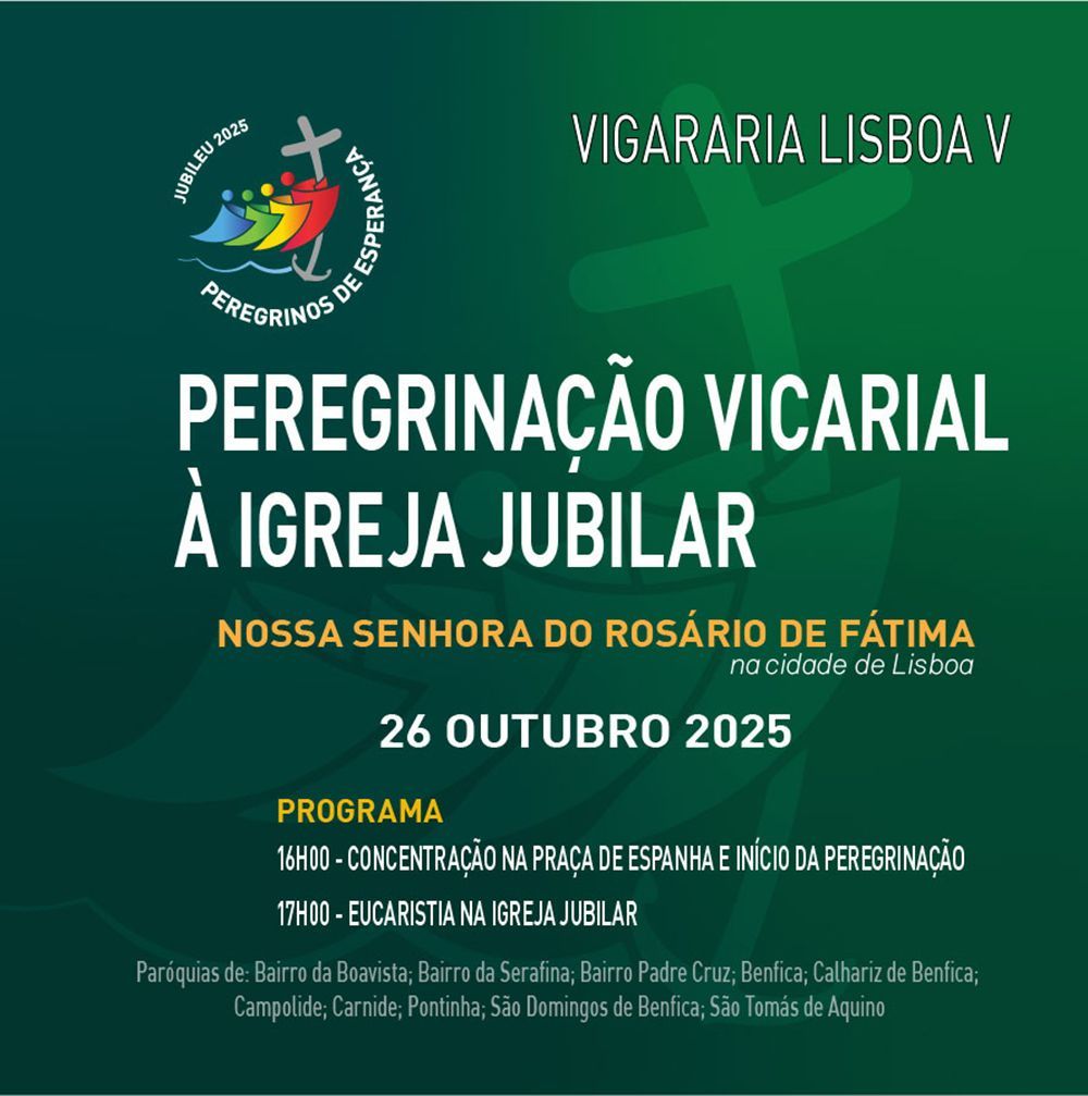 PEREGRINAÇÃO JUBILAR VICARIAL: Será no próximo 26 de outubro. Saída da Igreja Paroquial às 15h30 e caminhada até Praça de Espanha onde nos encontraremos com todas as paróquias da Vigararia. Daí caminharemos juntos até à Igreja Nossa Senhora do Rosário de Fátima (Av. Berna), onde celebraremos a Eucaristia às 17h00.