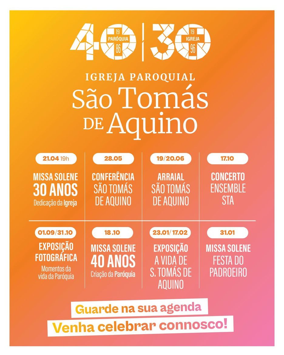 A nossa comunidade paroquial de São Tomás de Aquino prepara-se para viver um tempo particularmente significativo, marcado pela celebração de duas datas que fazem memória viva da nossa história: os 30 anos da Dedicação da Igreja e os 40 anos da criação da Paróquia.